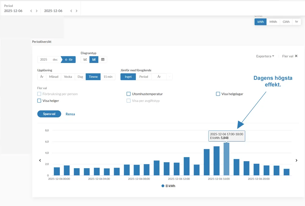 Logga in på Mina sidor för att se din förbrukningsstatistik timme för timme. Där kan du enkelt se när din elanvändning är som högst (dina effekttoppar) och